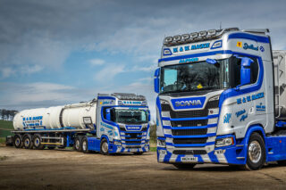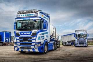 It was during harvest on the family farm that their journey into haulage began, when a truck and bulk trailer would be hired in to move material. The first truck they bought to run full-time was a Scania 114 380 6-wheeler with Hiab crane, which had been stretched into a rigid from a tractor unit.