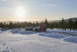 In Norway they they operate extra-large drawbars and multi-trailer articulated outfits at gross weights as high as 60 tonnes, in a country that has many very steep climbs that go on forever on many routes. Also, many operators choose 6×2 tag axle rigids and tractor units in preference to tandem drive axles for many applications. For many UK operators a 6×4 would be the minimum requirement for working in these conditions at high gross weights. But they do things differently in this part of the world, even if they do specify double drive bogies, they often employ weight transfer systems to get more weight onto the first driven axle. Logic says that it must all work, otherwise the entire country would have to go into hibernation for about five months every year.